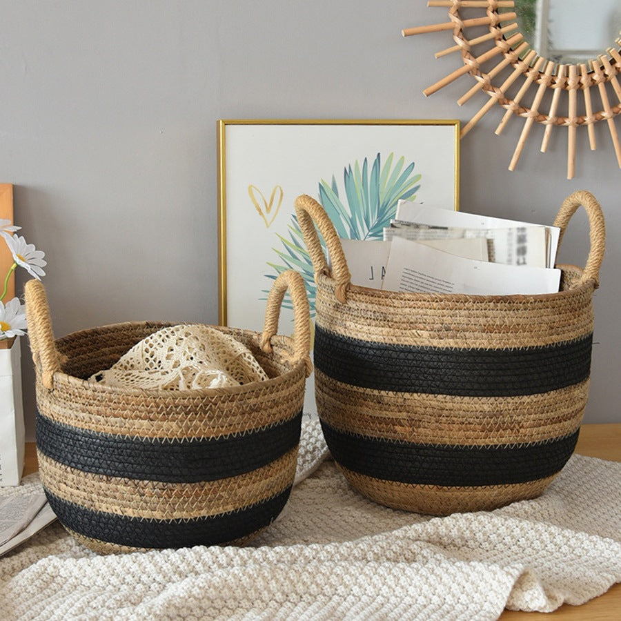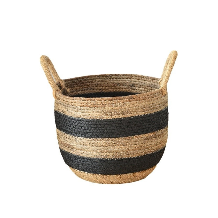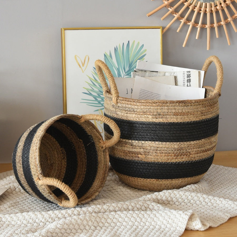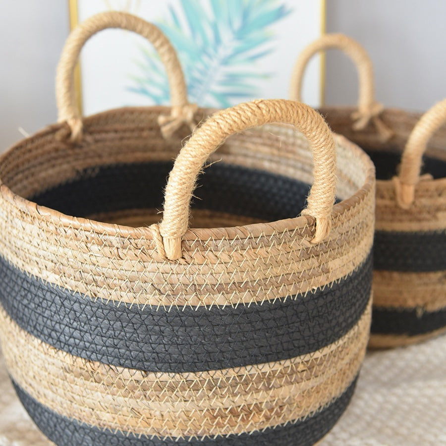 ナチュラルなシーグラス素材と、可愛らしいブラックストライプが特徴の収納バスケットです。リビングや寝室、子供部屋など、どんなお部屋にも馴染みます。ブランケットや雑誌、おもちゃなど、様々なものを収納できます。